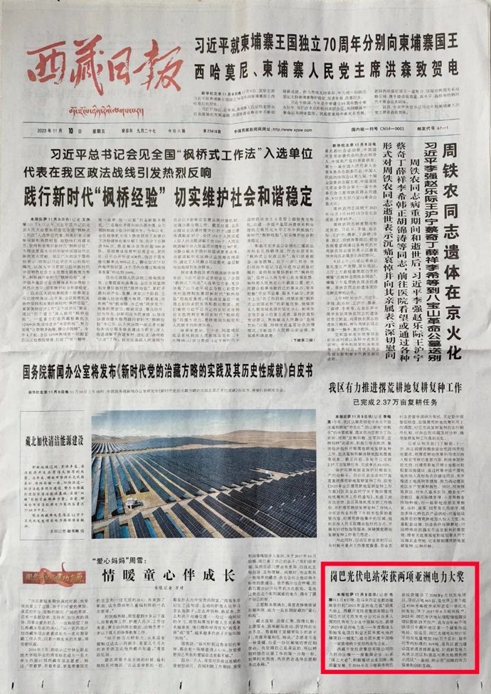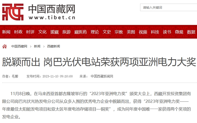 科技日報、西藏日報、西藏日報客戶端等多個媒體報道了《西藏開發(fā)投資集團有限公司崗巴光伏電站榮獲2023年度兩項亞洲電力大獎》