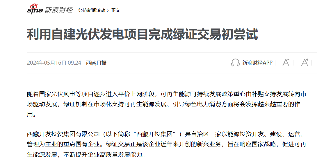 西藏日報、新浪財經(jīng)等媒體報道利用自建光伏發(fā)電項(xiàng)目完成綠證交易初嘗試